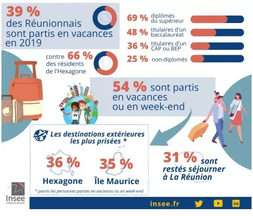 En 2019, 39 % des habitants de La Réunion de 15 ans ou plus déclarent être partis en vacances au cours des 12 derniers mois. C’est nettement moins que dans l’Hexagone (66 %). Les départs en vacances sont d’autant plus fréquents que le niveau de diplôme est élevé.
