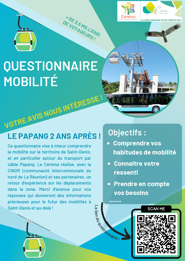 Le Cerema, en collaboration avec la CINOR (communauté intercommunale du nord de La Réunion) et ses partenaires, réalise une enquête pour mieux comprendre la mobilité à Saint-Denis, notamment autour du transport par câble Papang. Ce retour d’expérience a pour but de recueillir des informations précieuses sur les déplacements dans la zone.