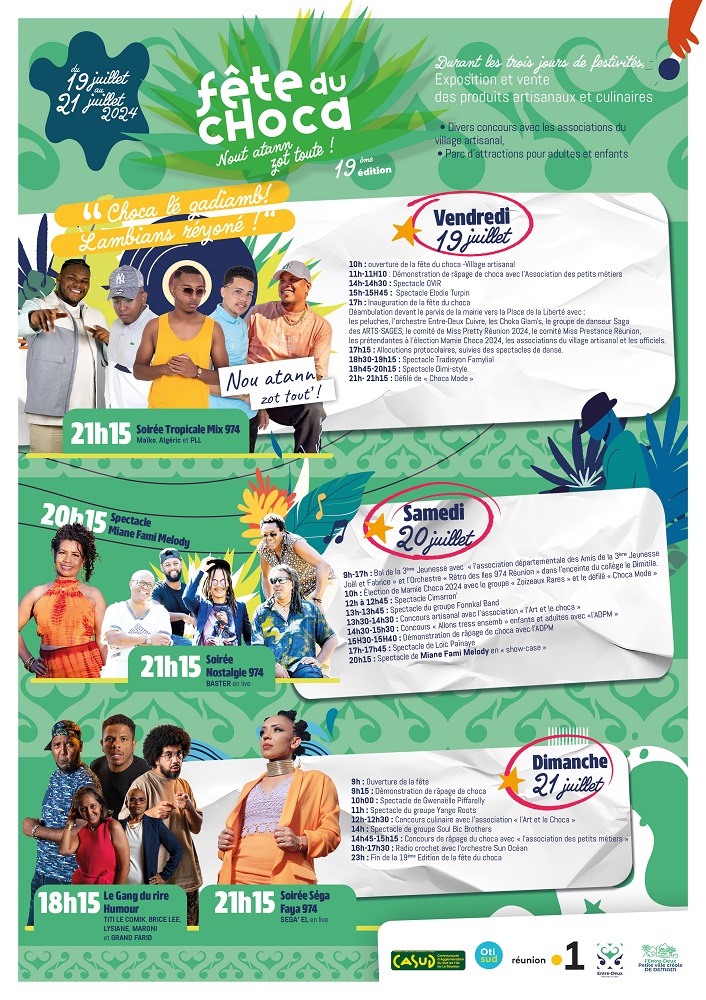 Le Maire Bachil Valy et le Conseil Municipal de l’Entre-Deux, ainsi que leurs partenaires, ont le plaisir de vous informer que la 19ème édition de la fête du choca aura lieu les 19, 20 et 21 juillet prochains.