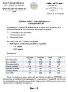 Dans un communiqué officiel daté du 19 mai 2024, le Ministère de la Santé, de la Solidarité, de la Protection Sociale et de la Promotion du Genre des Comores a rendu compte de la situation actuelle de l’épidémie de choléra qui sévit dans le pays.