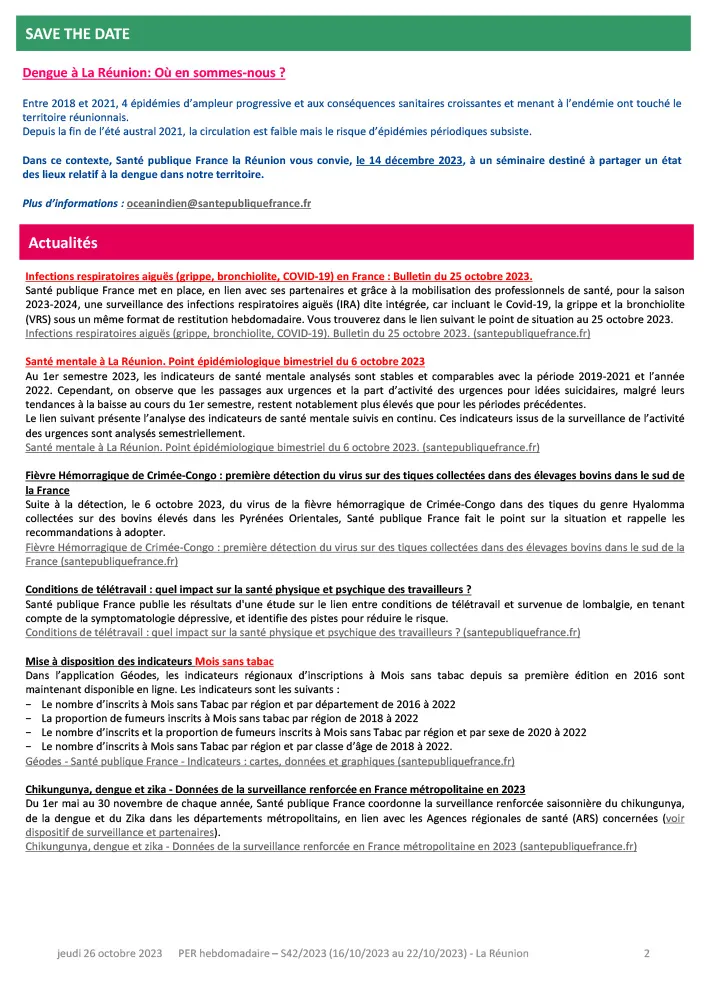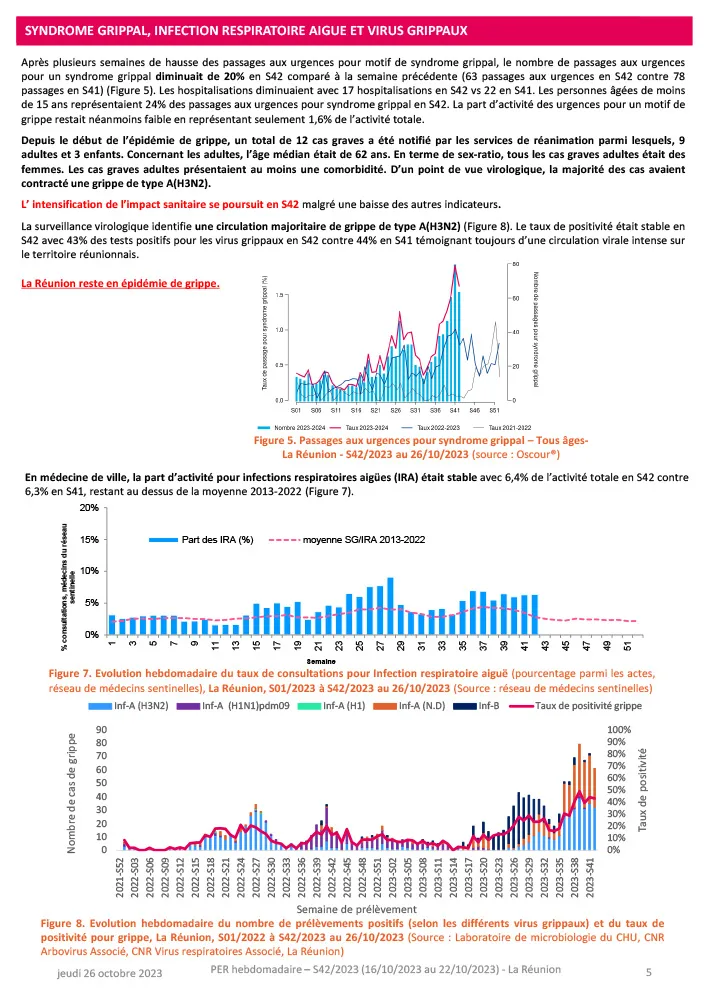 - Grippe : La Réunion reste en épidémie de grippe avec une circulation majoritaire de type A(H3N2). Intensification de l’impact sanitaire en S42 malgré une baisse des passages aux urgences. La part d’activité en médecine de ville et le taux de positivité de la grippe (42%) restaient stables en comparaison à la semaine précédente.