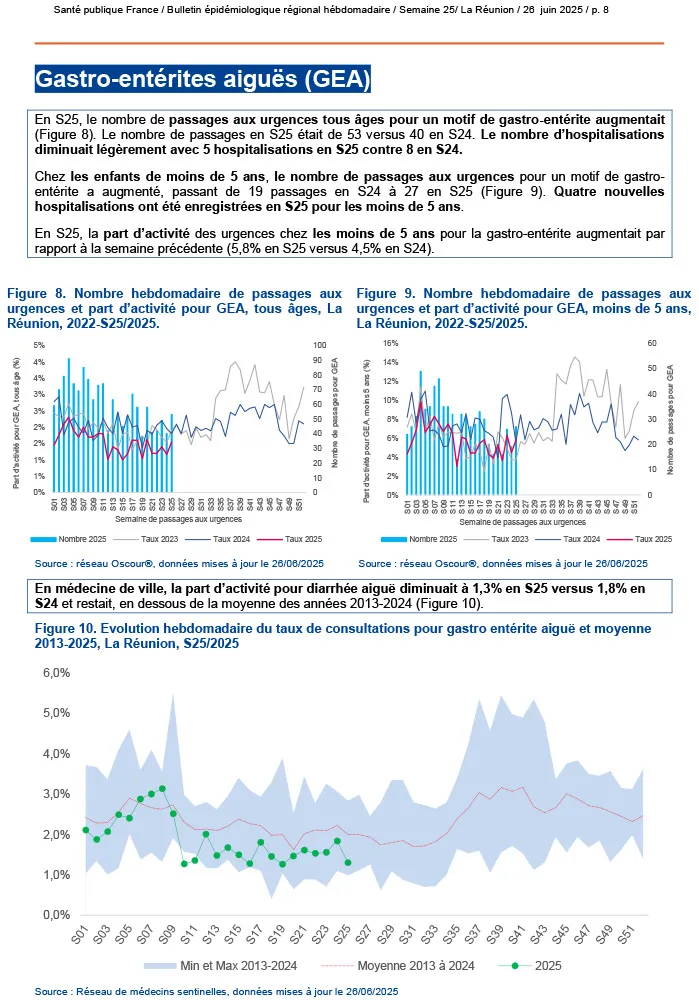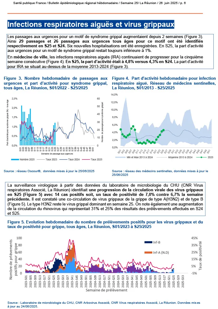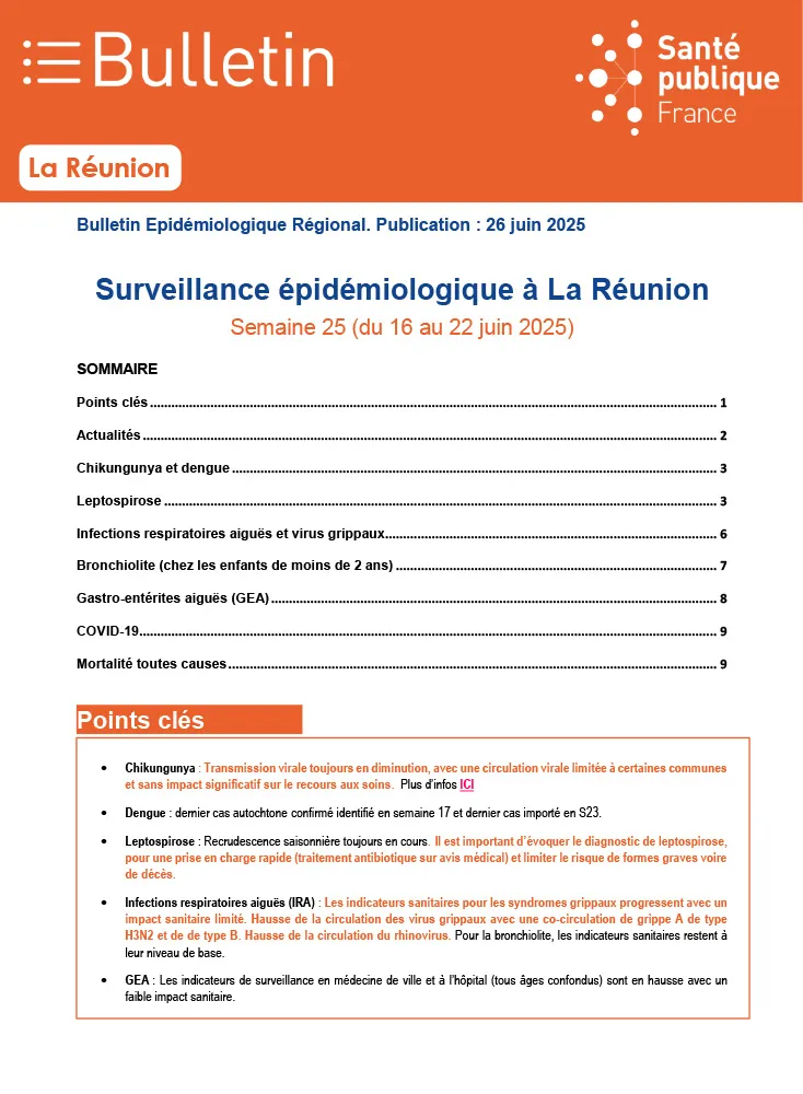 La leptospirose, fidèle à sa recrudescence saisonnière, impose de renouer avec les bons réflexes diagnostiques et un traitement antibiotique précoce pour éviter les formes graves. Parallèlement, les syndromes respiratoires aigus progressent ; la grippe A (H3N2), la grippe B et le rhinovirus co-circulent mais, pour l’heure, leur impact sanitaire reste limité. Même constat pour les gastro-entérites aiguës : les indicateurs en ville comme à l’hôpital repartent à la hausse, sans provoquer de tension majeure.