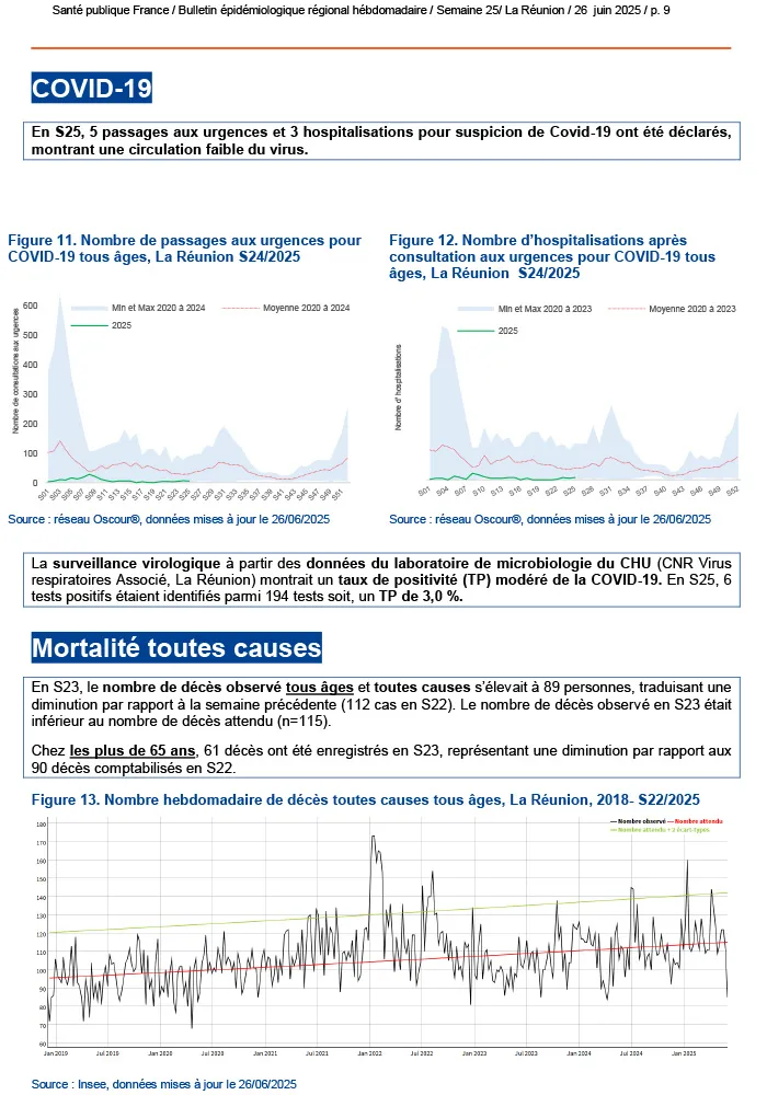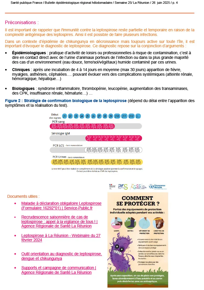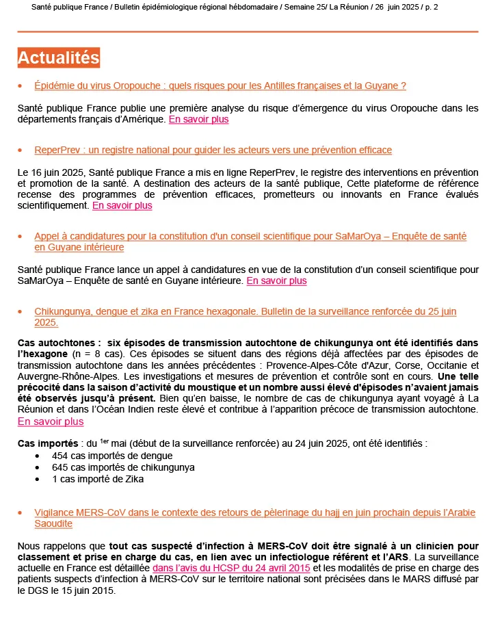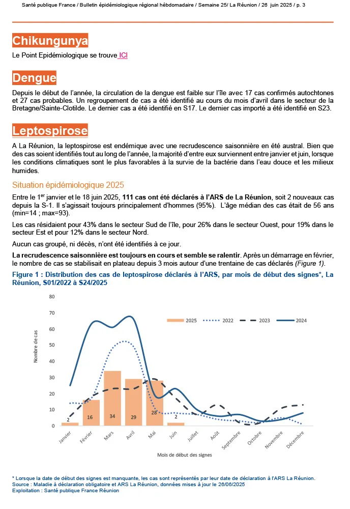 Au fil des dernières semaines, la situation épidémiologique de notre territoire révèle un paysage sanitaire contrasté : tandis que la circulation du chikungunya poursuit son repli et que les derniers cas autochtones de dengue datent déjà de la semaine 17, d’autres menaces regagnent du terrain.