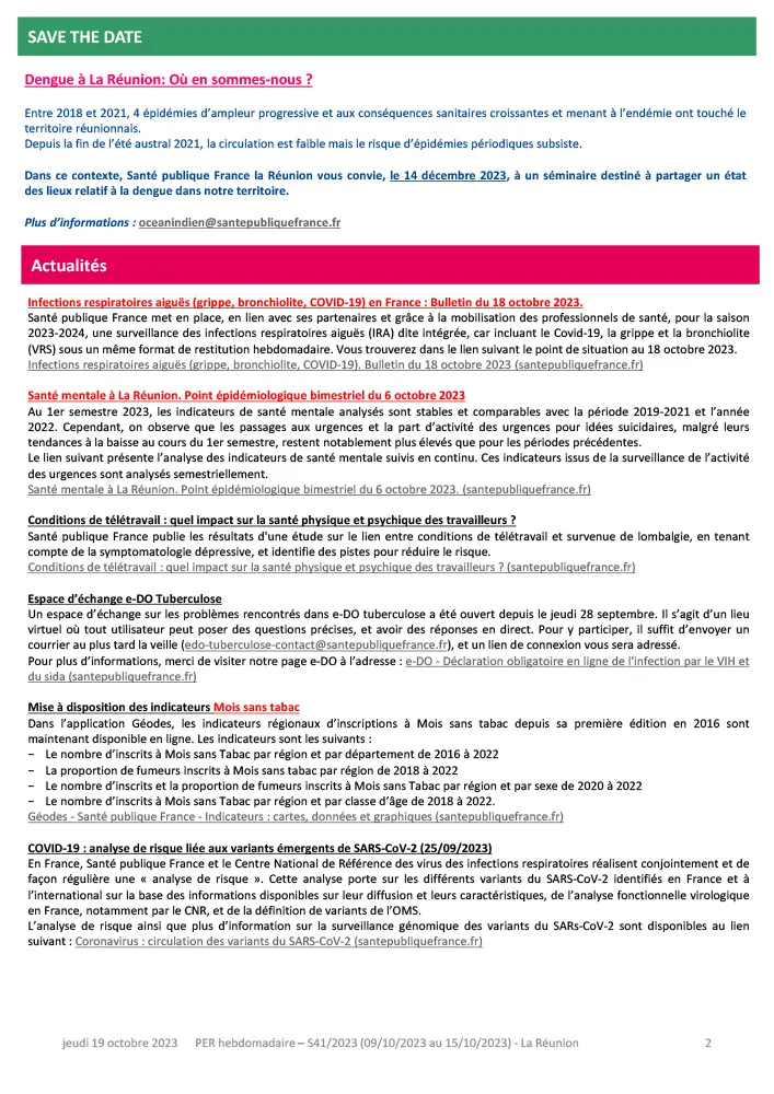 La semaine 41 de l’année 2023 (du 9 au 15 octobre) apporte un aperçu de la situation épidémiologique à La Réunion.