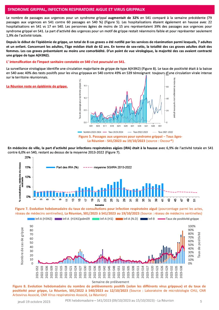 - Grippe : La Réunion est en épidémie de grippe avec une circulation majoritaire de type A(H3N2). Poursuite de la hausse des passages aux urgences avec une intensification de l’impact sanitaire qui se confirme par rapport à la semaine précédente.