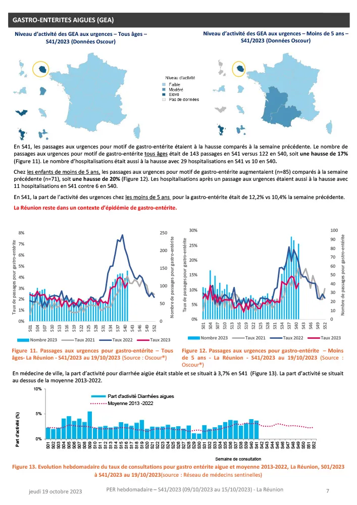 - Gastro-entérite : La réunion est en épidémie de gastro-entérite (Hausse des passages aux urgences, stabilité de l’activité des médecins sentinelles)