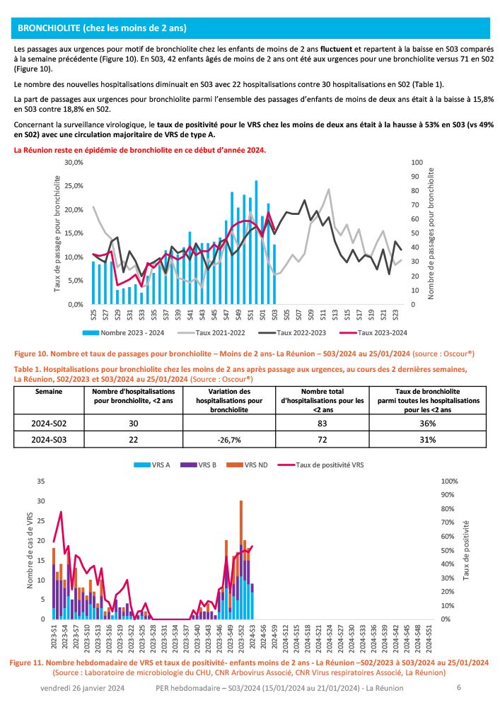 - Bronchiolite chez les moins de 2 ans : La Réunion reste en épidémie de bronchiolite. Le taux de positivité VRS chez les moins de 2 ans était de 53% en S03 avec une circulation majoritaire de VRS de type A.