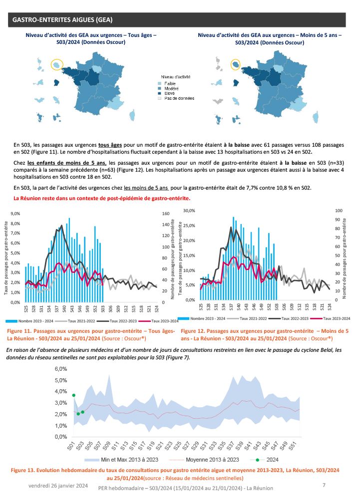 - Gastro-entérite : La Réunion reste en phase de post-épidémie de gastro-entérite. Les indicateurs étaient à la baisse en S03 en comparaison à la semaine précédente.