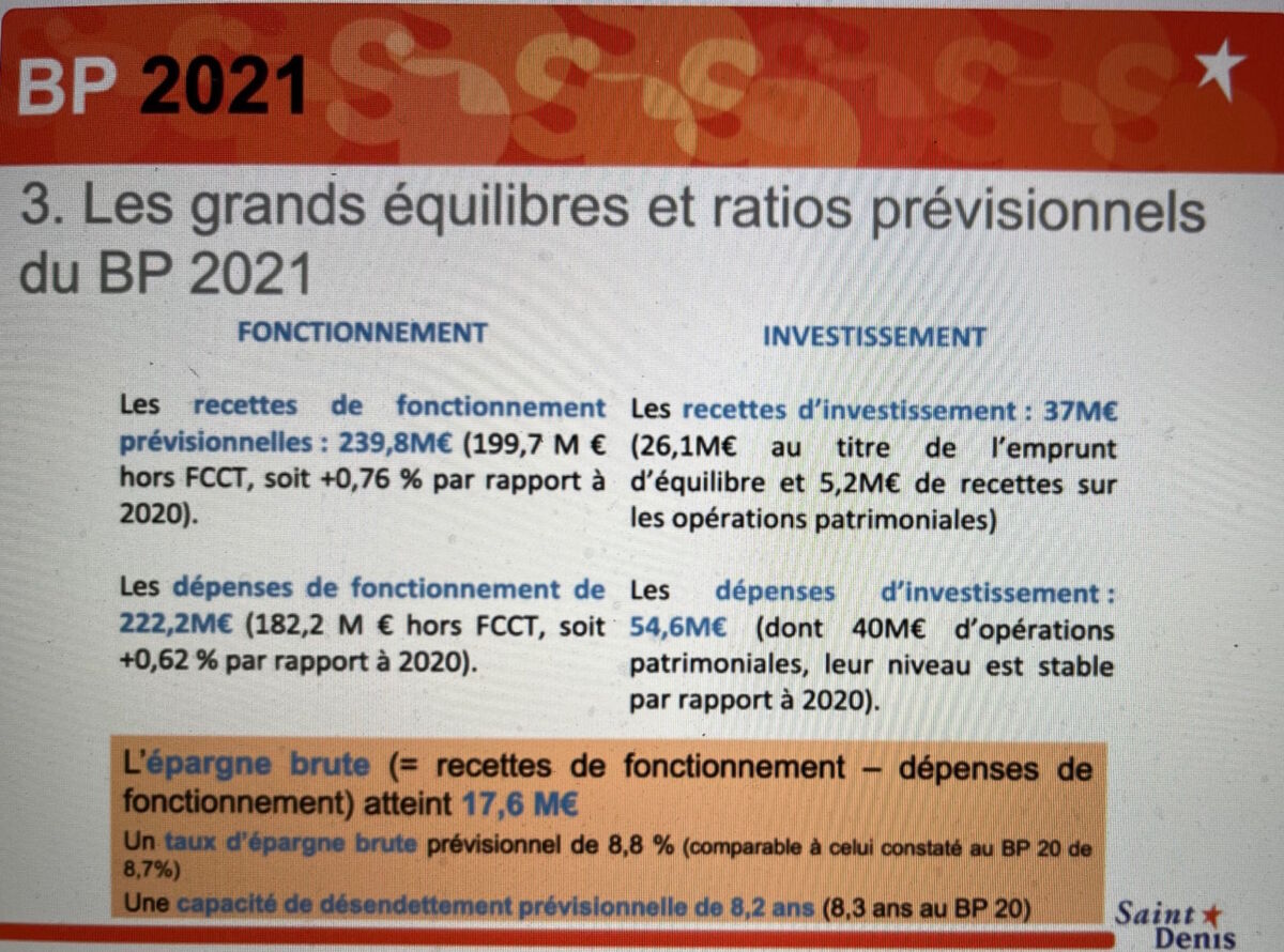 Et Pierrot Dupuy de poursuivre : « A Saint-Denis, les dépenses de fonctionnement s’établissaient dans le budget primitif 2020 à 215,58 M€ pour le fonctionnement et 69, 62 M€ pour l’investissement, soit un ratio de seulement 25% pour l’investissement et de 75% pour le fonctionnement.