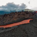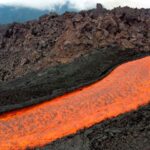 - l’écoulement de la lave à la sortie des bouches éruptives, se fait essentiellement en tunnels et ce presque jusqu’à la limite supérieure des grandes pentes, où des résurgences de lave sont visibles en surface,