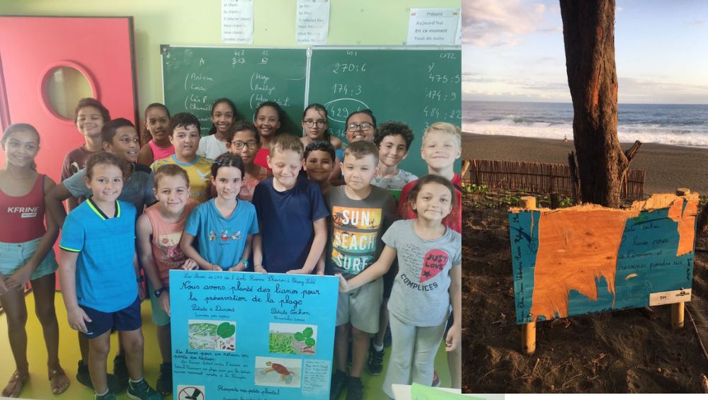 Il y a à peine deux semaines, une classe d’élèves de CM2 a participé avec beaucoup d’engouement à la plantation de lianes pour lutter contre l’érosion de la plage de Ravine Mulla à Etang Salé, et a créé et implanté deux panneaux de sensibilisation pour sensibiliser sur l’action réalisée et son objectif.