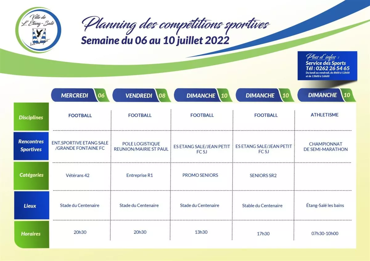 Non classé Étang-Salé : Planning des competitions sportives par La rédaction F R 8 juillet 2022 1 min de lecture Voici le planning des compétitions sportives de la ville de L’Etang-Salé [ – ] Ça se passe à L’Étang-Salé ! Ce dimanche 10 juillet 2022 Départ à 07H00 au camping de L’Étang-Salé les bains Ne manquez pas toute l’actualité de La Réunion ! Abonnez-vous à la newsletter de Free Dom ! Valider Partager Facebook Twitter Pinterest Linkedin Whatsapp Reddit Email Vous pourriez être intéressé par 25 décembre 2025 Mais qui à remplacé notre voile d’avant ? 23 décembre 2025 Le Port : carambolage impliquant plusieurs voitures à la ZAC 2000 17 décembre 2025 Travaux de fauchage sur la RN6 à Saint-Denis : circulation interrompue mercredi soir La rédaction F R Laisser un commentaire Annuler la réponseYour email address will not be published. Enregistrer mon nom, mon e-mail et mon site dans le navigateur pour mon prochain commentaire. Current ye@r * Leave this field empty Article précédent Bras-Panon : découvrez l’ensemble des manifestations programmées ce week-end Article suivant Le Séchoir : 2ème édition des « 7jours7kartyé » du 6 au 22 juillet 2022 Articles récents... Jeudi 1ᵉʳ janvier 2026 – Météo, éphéméride et horoscope du jour Mercredi 31 décembre 2025 – Météo, éphéméride et horoscope du jour Hommage à Johnny Hallyday sur Free Dom 2 ce 5 décembre Mardi 30 décembre 2025 – Météo, éphéméride et horoscope du jour Saint-Joseph : découverte de 2337 plants de cannabis, arrestation de 2 individus Point sur le réseau routier départemental, 29 décembre à 16H30 Suicide sur le pont de la Rivière d’Abord : importante mobilisation des secours et des forces de l’ordre Radier submergé à Ilet Furcy : la route de Cilaos fermée à la circulation cette nuit Fortes pluies : appel à la plus grande prudence à Saint-Paul Saint-Gilles-les-Bains : une route impraticable, les riverains montent au créneau (VIDEOS)