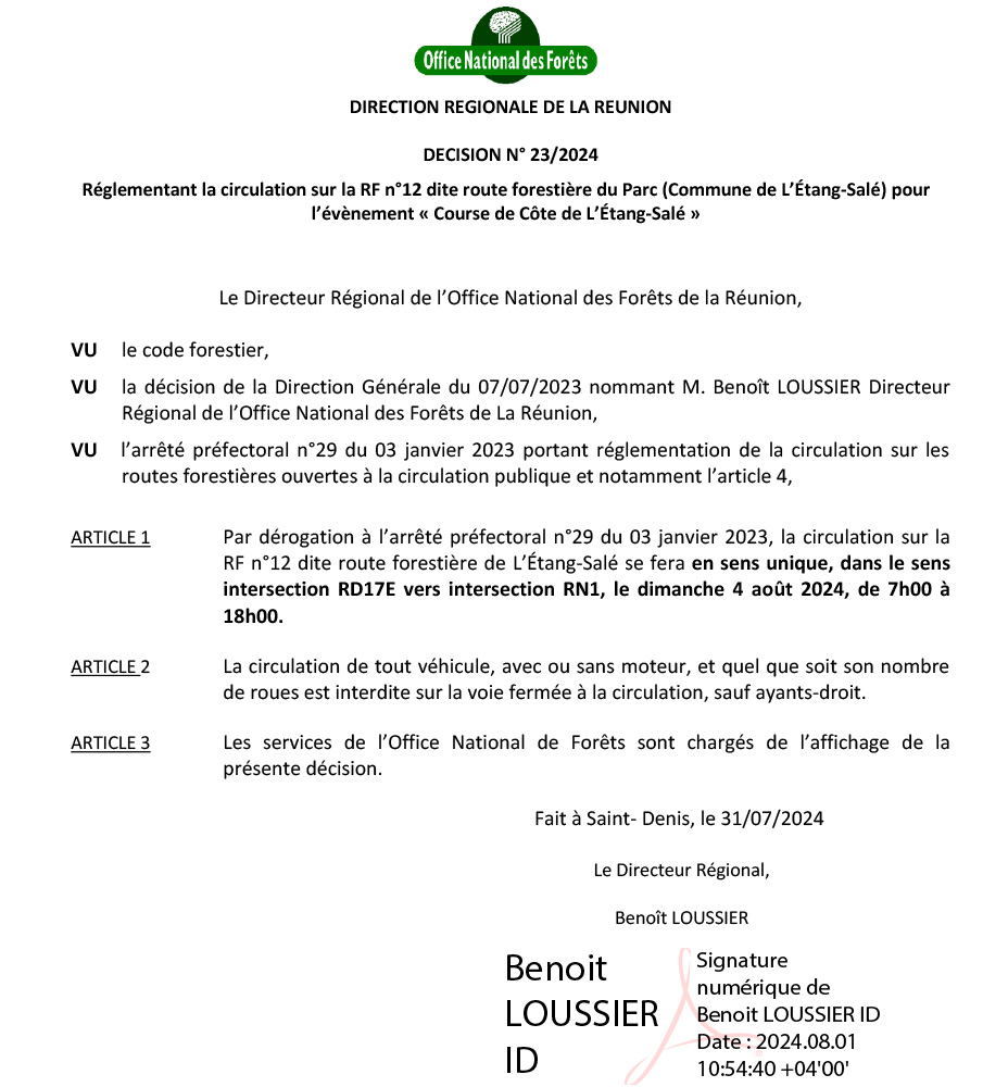 Dans le cadre de l’évènement « Course de Côte de L’Étang-Salé », la RF12 dite route forestière du Parc doit être mise en circulation en sens unique, dans le sens intersection RD17E vers intersection RN1, le dimanche 4 août 2024 de 7h00 à 18h00.