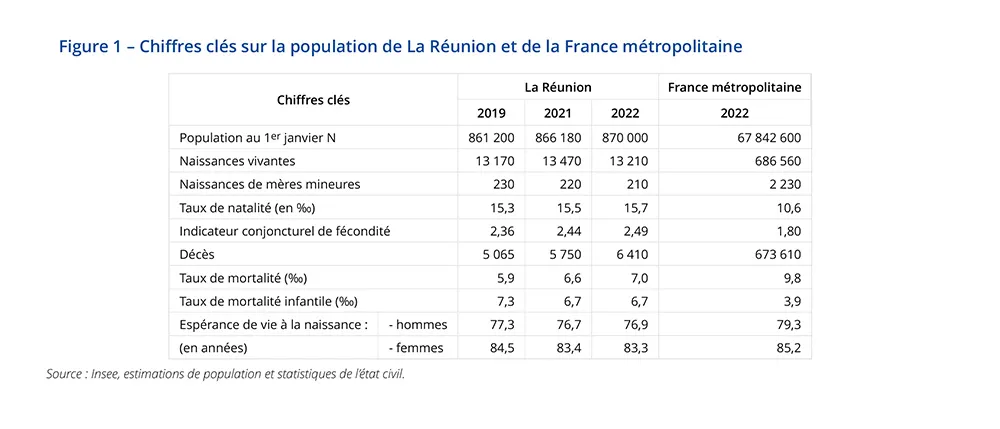 Au 1er janvier 2023, la population réunionnaise est estimée à 873 100 habitants. En 2022, à La Réunion, les décès augmentent nettement par rapport à 2019, avant la crise sanitaire. Ainsi, 6 410 personnes résidant sur l’île décèdent, soit 1 350 de plus qu’en 2019. La hausse des décès résulte du vieillissement de la population, mais est amplifiée par la crise épidémique liée à la Covid-19. L’espérance de vie recule légèrement par rapport à 2019.