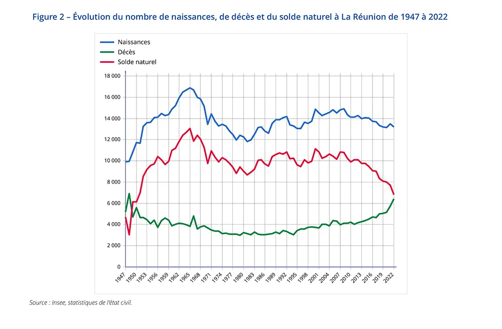 En effet, si le solde naturel, différence entre le nombre de naissances et de décès, porte toujours la croissance de la population réunionnaise, il diminue sensiblement depuis dix ans. En 2022, il atteint ainsi son niveau le plus faible depuis 1950 : le nombre de décès augmente, alors que les naissances repartent à la baisse.