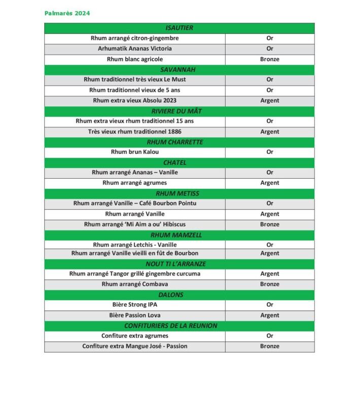 Les rhums réunionnais obtiennent ainsi 18 médailles dont 9 en or, 6 en argent et 3 de bronze. Seule à concourir dans les bières, la brasserie Dalons en obtient une en or et une en argent. Les confituriers repartent avec 2 médailles d’or, 2 médailles d’argent et 2 de bronze, quand les miels en décrochent 3 en or, 2 en argent et 1 en bronze.