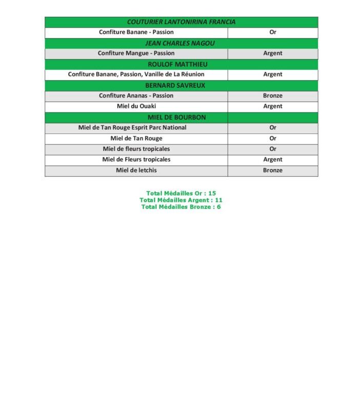 Toujours en alcool, la nouveauté cette année était l’inscription de la brasserie Dalons au Concours Général Agricole. Une inscription réussie puisqu’elle apporte deux médailles, une en or et une en argent. C’est la première fois qu’une bière réunionnaise se voit distinguée dans ce challenge prestigieux. Bravo ! Dans la catégorie des confitures, La Réunion s’est aussi vue attribuer 6 médailles (2 en or, 2 en argent et 2 en bronze). Reconnus pour leur produits d’excellence et leur capacité à sublimer nos fruits péï, les Confituriers de La Réunion obtiennent 2 médailles, une en or et une en bronze. A leurs côtés, Couturier Francia Lantonirina décroche une magnifique médaille d’or. Installé dans le Nord du territoire, Jean Charles Nagou obtient une médaille d’argent tout comme Matthieu Rouloff. Enfin, Bernard Savreux décroche également une médaille de bronze dans la catégorie confitures. En 2023, les miels péï avaient déjà brillé. C’est encore le cas pour ce millésime 2024 avec 6 médailles dont 5 pour Miel de Bourbon qui transforme magnifiquement l’essai avec 3 médailles d’or, une médaille d’argent et une médaille de bronze. Bernard Savreux complète ce palmarès avec une médaille d’argent. En tant que président de la Chambre d’agricultures, ces résultats démontrent avec force l’excellence de nos productions. Je tiens dans ce sens à féliciter les lauréats de ce concours. Partenaire exclusif du Concours Général Agricole, la Chambre continuera à œuvrer dans le sens de la transformation de nos productions qui montrent que nous n’avons à rougir de personne en matière de savoir-faire. Vous pouvez être fier(e)s du travail accompli et de votre engagement à faire rayonner l’agriculture réunionnaise au-delà de nos frontières.