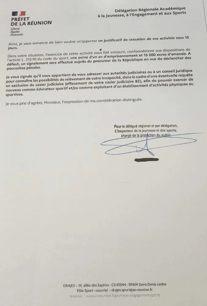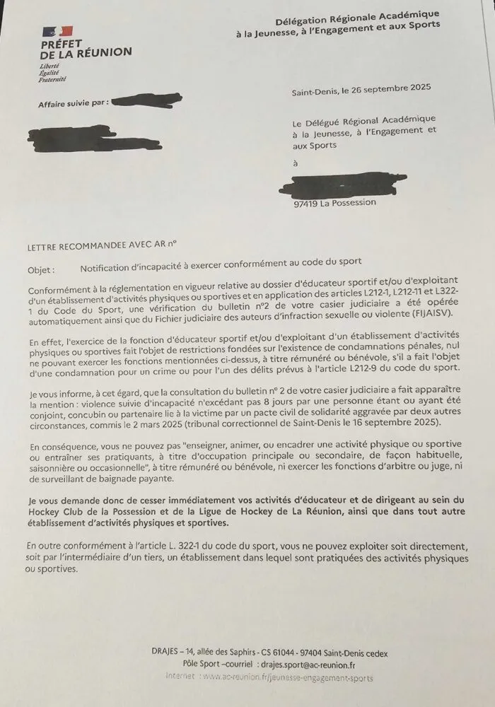 Le courrier officiel, que Freedom a pu consulter en exclusivité, précise également l’interdiction d’exercer des fonctions de dirigeant, d’arbitre, de juge ou de surveillant de baignade payante. Il est sommé de cesser immédiatement ses fonctions au sein du Hockey Club de La Possession et de la Ligue de Hockey de La Réunion, sous peine de poursuites pénales.