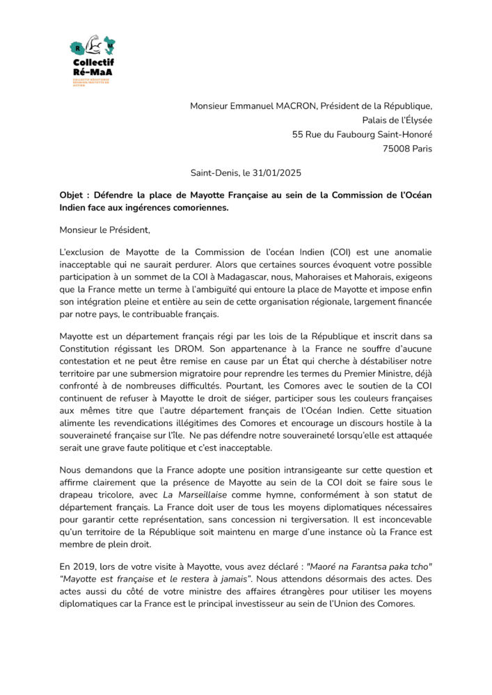 Exclusion de Mayotte de la COI : le collectif Ré-MAa interpelle le président Emmanuel Macron