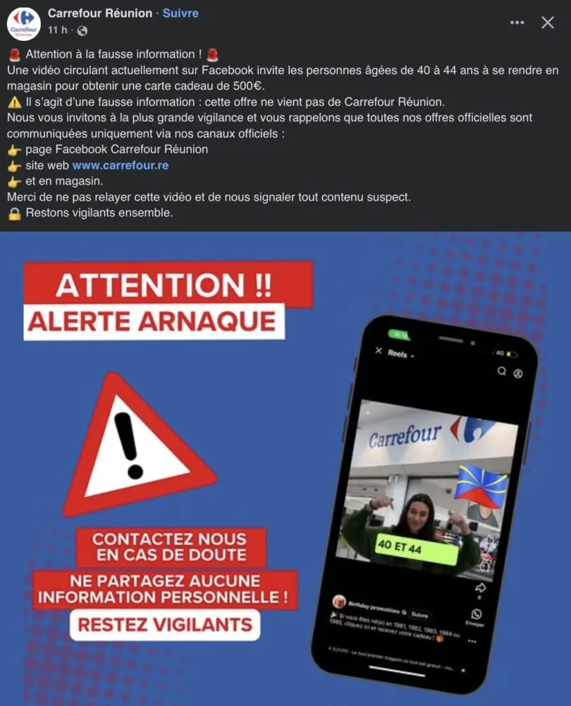 Une vidéo relayée sur les réseaux sociaux suscite actuellement l’inquiétude à La Réunion. Elle prétend qu’une carte cadeau de 500 euros serait offerte en magasin à toute personne âgée de 40 à 44 ans. Une affirmation totalement fausse, selon Carrefour Réunion, qui alerte les consommateurs sur cette escroquerie.