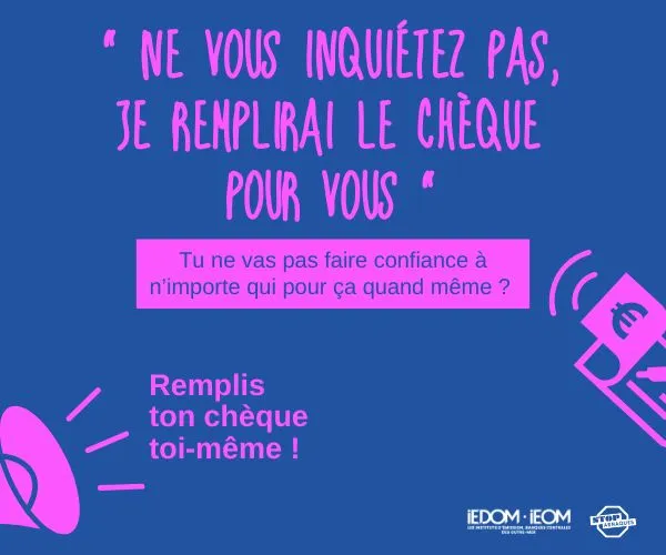 Afin de toucher le plus grand nombre et d’éviter de longs discours complexes, l’IEDOM et l’IEOM mettent en ligne 3 visuels colorés sur un ton direct. L’objectif est simple : informer sur l’action immédiate à faire quand on est confronté à ces situations pour éviter de se faire arnaquer.