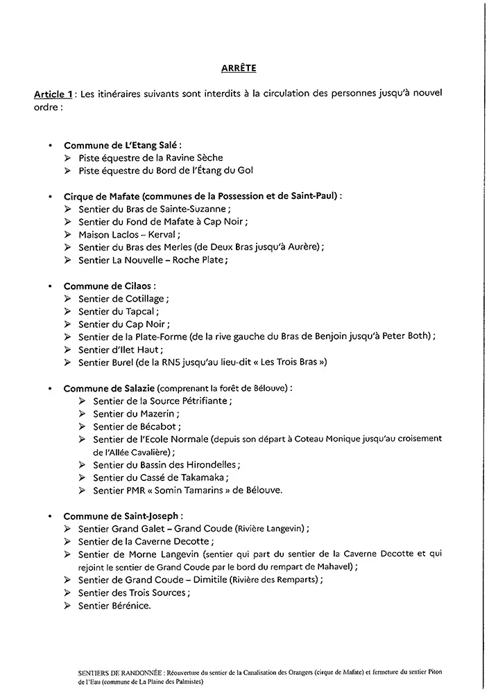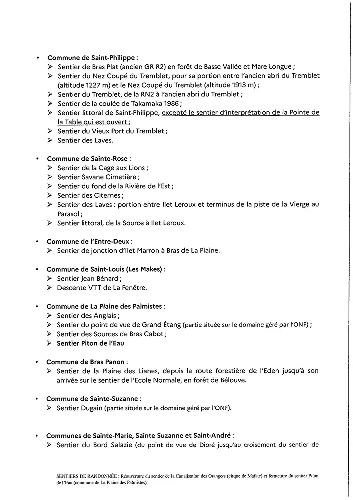 Actualités Plaine-des-Palmistes : fermeture du sentier Piton de l’Eau par Céline Hardelain 17 avril 2023 1 min de lecture Le sentier Piton de l’Eau (commune de La Plaine des Palmistes) est détérioré et présente de nombreux passages dangereux pour les randonneurs. Il doit être fermé au public dans l’attente de sa réhabilitation. Ne manquez pas toute l’actualité de La Réunion ! Abonnez-vous à la newsletter de Free Dom ! Valider Partager Facebook Twitter Pinterest Linkedin Whatsapp Reddit Email Vous pourriez être intéressé par 1 janvier 2026 Jeudi 1ᵉʳ janvier 2026 – Météo, éphéméride et horoscope du jour 31 décembre 2025 Mercredi 31 décembre 2025 – Météo, éphéméride et horoscope du jour 30 décembre 2025 Mardi 30 décembre 2025 – Météo, éphéméride et horoscope du jour Céline Hardelain Laisser un commentaire Annuler la réponseYour email address will not be published. Enregistrer mon nom, mon e-mail et mon site dans le navigateur pour mon prochain commentaire. Current ye@r * Leave this field empty Article précédent St-André : l’Etat de Catastrophe Naturelle reconnue suite aux fortes précipitations du 25 et 26 janvier Article suivant Réforme des retraites : le Conseil Constitutionnel valide l’âge de départ à 64 ans Articles récents... Jeudi 1ᵉʳ janvier 2026 – Météo, éphéméride et horoscope du jour Mercredi 31 décembre 2025 – Météo, éphéméride et horoscope du jour Hommage à Johnny Hallyday sur Free Dom 2 ce 5 décembre Mardi 30 décembre 2025 – Météo, éphéméride et horoscope du jour Saint-Joseph : découverte de 2337 plants de cannabis, arrestation de 2 individus Point sur le réseau routier départemental, 29 décembre à 16H30 Suicide sur le pont de la Rivière d’Abord : importante mobilisation des secours et des forces de l’ordre Radier submergé à Ilet Furcy : la route de Cilaos fermée à la circulation cette nuit Fortes pluies : appel à la plus grande prudence à Saint-Paul Saint-Gilles-les-Bains : une route impraticable, les riverains montent au créneau (VIDEOS)