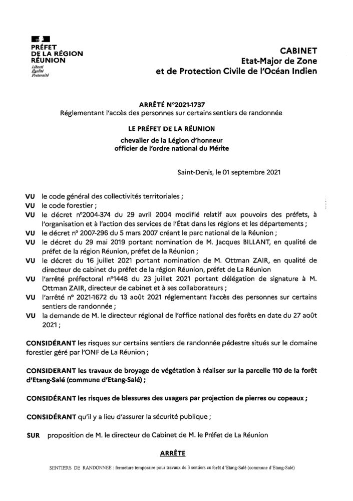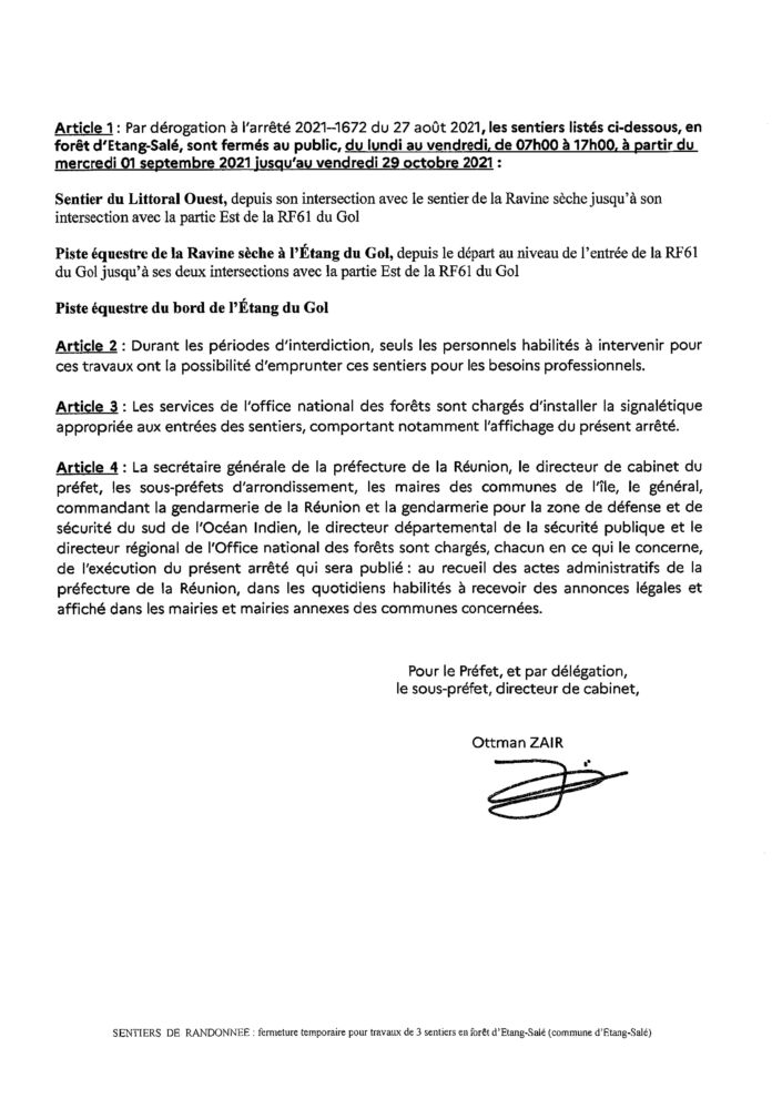 Actualités Fermeture temporaire de 3 sentiers en forêt d’Etang Salé par La Rédaction 2 septembre 2021 1 min de lecture Un arrêté préfectoral a été pris le 1er septembre indiquant la fermeture temporaire de 3 sentiers en forêt d’Etang-Salé, afin de pouvoir réaliser des travaux de broyage de végétation sans mettre en danger les usagers. Ne manquez pas toute l’actualité de La Réunion ! Abonnez-vous à la newsletter de Free Dom ! Valider Partager Facebook Twitter Pinterest Linkedin Whatsapp Reddit Email Vous pourriez être intéressé par 31 décembre 2025 Mercredi 31 décembre 2025 – Météo, éphéméride et horoscope du jour 30 décembre 2025 Mardi 30 décembre 2025 – Météo, éphéméride et horoscope du jour 29 décembre 2025 Saint-Joseph : découverte de 2337 plants de cannabis, arrestation de 2 individus La Rédaction Laisser un commentaire Annuler la réponseYour email address will not be published. Enregistrer mon nom, mon e-mail et mon site dans le navigateur pour mon prochain commentaire. Current ye@r * Leave this field empty Article précédent Chaudron : le chauffeur oublie de serrer le frein à main et le véhicule a failli écraser un snack Article suivant Madagascar : la peste est de retour, 7 décès à Arivonimamo Articles récents... Mercredi 31 décembre 2025 – Météo, éphéméride et horoscope du jour Hommage à Johnny Hallyday sur Free Dom 2 ce 5 décembre Mardi 30 décembre 2025 – Météo, éphéméride et horoscope du jour Saint-Joseph : découverte de 2337 plants de cannabis, arrestation de 2 individus Point sur le réseau routier départemental, 29 décembre à 16H30 Suicide sur le pont de la Rivière d’Abord : importante mobilisation des secours et des forces de l’ordre Radier submergé à Ilet Furcy : la route de Cilaos fermée à la circulation cette nuit Fortes pluies : appel à la plus grande prudence à Saint-Paul Saint-Gilles-les-Bains : une route impraticable, les riverains montent au créneau (VIDEOS) Très grands excès de vitesse : un délit passible de prison depuis le 29 décembre 2025