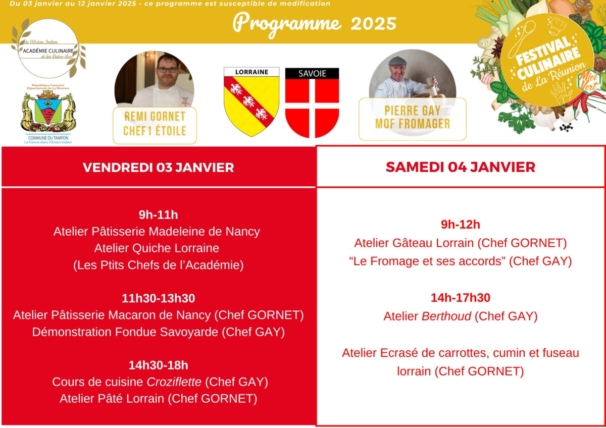 Le Chef Gornet, originaire des Vosges, nous confie qu’il adore revisiter ses recettes en s’inspirant des produits locaux. Pendant le festival, il proposera aussi des ateliers sucrés et salés, mettant à l’honneur des classiques de la gastronomie lorraine, comme le soufflé à la mirabelle, tout en adaptant ses créations aux saveurs réunionnaises. « La cuisine, c’est avant tout du partage », explique-t-il, en évoquant sa passion pour l’échange culturel et culinaire.