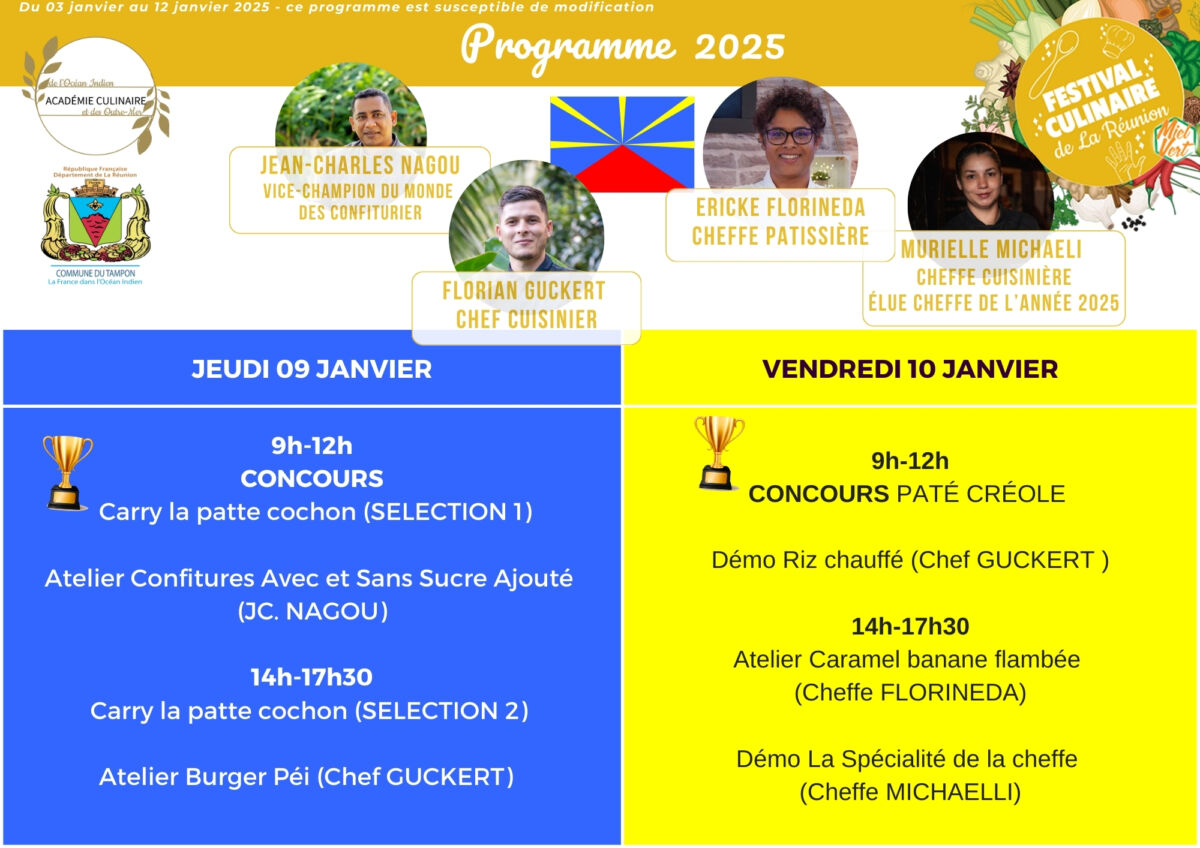 Ce jeudi 9 janvier, le programme met en avant des ateliers et concours culinaires qui raviront les passionnés de cuisine. Le matin, de 9h à 12h, place au concours « Carry la patte cochon » (Sélection 1), une véritable immersion dans la tradition réunionnaise. Parallèlement, Jean-Charles Nagou, vice-champion du monde des confituriers, anime un atelier autour des confitures avec et sans sucre ajouté.