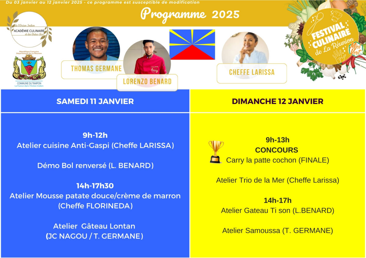 Du 3 au 12 janvier 2025, plongez dans l’univers de la gastronomie et rendez-vous au gymnase du Miel Vert pour célébrer les saveurs d’ici et d’ailleurs.