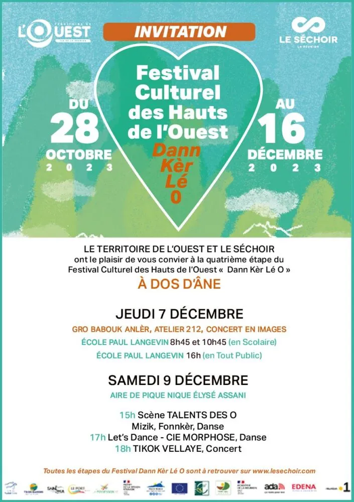 Direction : Dos d’Âne ce samedi 09 décembre dés 15h pour le dernier gros temps fort avec les associations , la population du quartier et les artistes qui seront en pleine préparation dès le matin. Entre le monde féerique des comptines revisitées et réinventées avec le spectacle de « Gro babouk Anlèr », les fonnkézer et les artistes de cirque des « talents des O » ou tout simplement l’invitation de « Let’s dance » de la compagnie Morphose, ce festival fera battre le cœur des petits et des grands qui auront le plaisir de vivre une fin de soirée mémorable avec un zarboutan péi incontournable, Tikok VELLAYE .