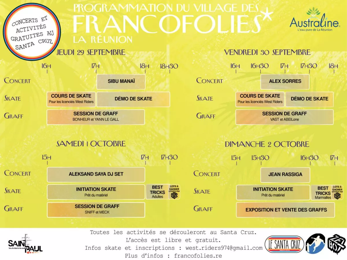 Le Village des Francofolies situé au Santa Cruz à la Saline-les-Bains, proposera des activités gratuites en après-midi et fin d’après-midi, l’accès est libre et ouvert à tous. Des concerts auront lieux dans les rondavelles de l’Uni VERT, du Cap Sunset et des Balançoires Sunset Club.