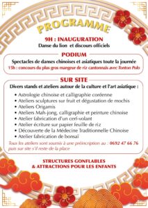 Flyers verso festivités chinoise_programme par Céline Hardelain 13 février 2024 1 min de lecture Ne manquez pas toute l’actualité de La Réunion ! Abonnez-vous à la newsletter de Free Dom ! Valider Partager Facebook Twitter Pinterest Linkedin Whatsapp Reddit Email Céline Hardelain Laisser un commentaire Annuler la réponseYour email address will not be published. Enregistrer mon nom, mon e-mail et mon site dans le navigateur pour mon prochain commentaire. Current ye@r * Leave this field empty Articles récents... Jeudi 1ᵉʳ janvier 2026 – Météo, éphéméride et horoscope du jour Mercredi 31 décembre 2025 – Météo, éphéméride et horoscope du jour Hommage à Johnny Hallyday sur Free Dom 2 ce 5 décembre Mardi 30 décembre 2025 – Météo, éphéméride et horoscope du jour Saint-Joseph : découverte de 2337 plants de cannabis, arrestation de 2 individus Point sur le réseau routier départemental, 29 décembre à 16H30 Suicide sur le pont de la Rivière d’Abord : importante mobilisation des secours et des forces de l’ordre Radier submergé à Ilet Furcy : la route de Cilaos fermée à la circulation cette nuit Fortes pluies : appel à la plus grande prudence à Saint-Paul