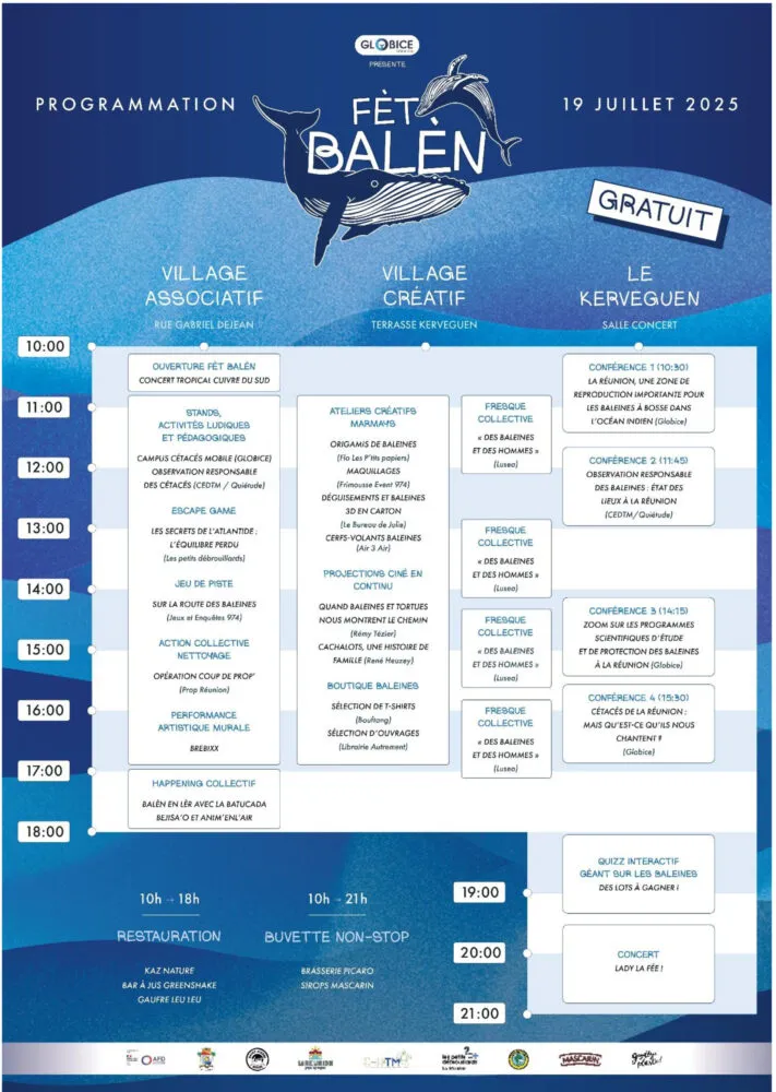 Pour la première fois, l’île de La Réunion accueillera un événement d’ampleur dédié aux baleines à bosse : la Fèt Balèn, organisée par Globice Réunion. L’événement, gratuit et ouvert à tous, se tiendra le samedi 19 juillet de 10h à 21h au Kerveguen, à Saint-Pierre. Une journée entière mêlant science, culture, art et engagement écologique pour célébrer ces visiteurs majestueux des eaux réunionnaises.