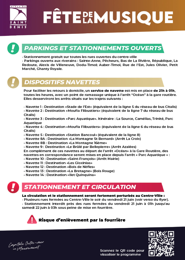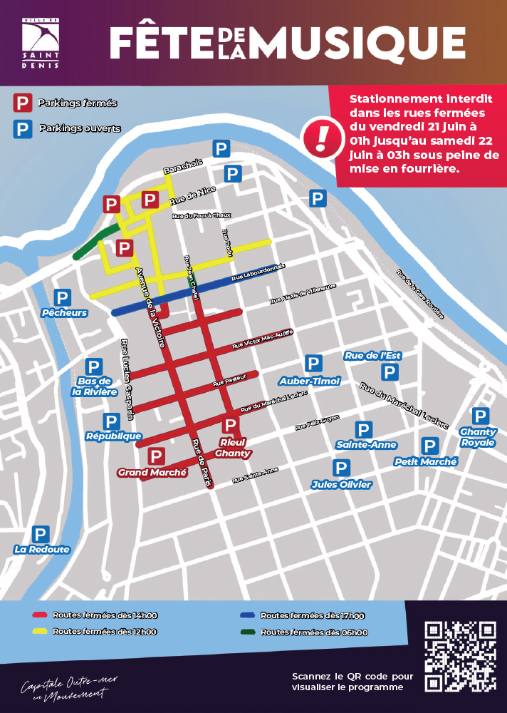 À l’occasion de la Fête de la Musique qui se tiendra le vendredi 21 juin 2024 à Saint-Denis, la SODIPARC met en place un dispositif spécial de stationnement pour faciliter l’accès des festivaliers et assurer un déroulement harmonieux de l’événement.