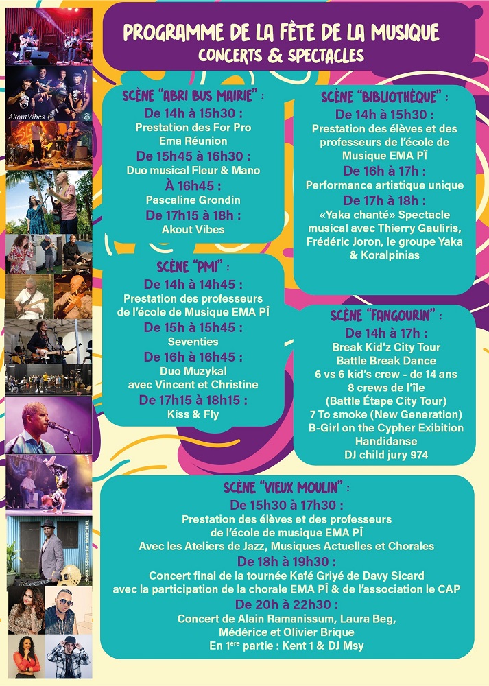 Le samedi 22 juin, le centre-ville de Petite-Île s’animera pour la fête de la musique avec une série d’événements festifs. La ville invite tous les habitants à assister aux concerts de l’EMA PÎ et à celui de Davy Sicart.