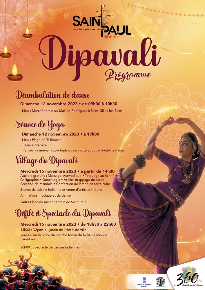 Saint-Paul s’illumine pour le DIPAVALI le 15 novembre à partir de 18h30. Un défilé lumineux du Jardin de l’Hôtel de Ville à la Place du marché forain. Sur la Place, découvrez le Grand Village du DIPAVALI : massage ayurvédique, tatouage au henné, drapage de saree, confection de lampes en terre cuite, et bien plus.