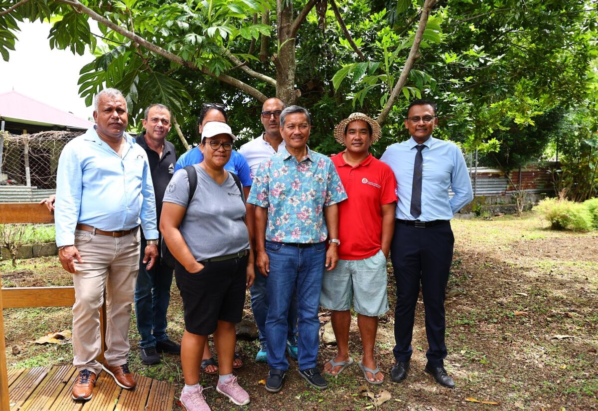 Le maire de Bras-Panon, Jeannick Atchapa (à droite) ici en compagnie de Thierry Henriette son 1er adjoint, président de la Safer, de Frédéric Vienne, président de la Chambre d’agriculture de la Réunion et d’une délégation polynésienne. (Crédit photo : service Com’ mairie de Bras-Panon)