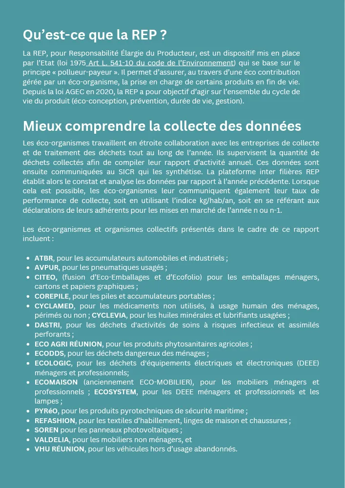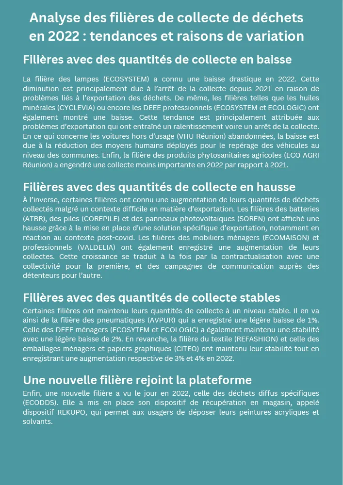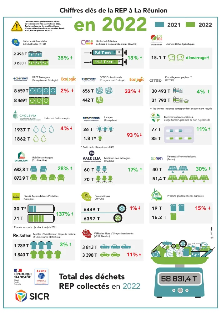 Le bilan des filières REP 2022 est réalisé par la plateforme inter-filières REP Océan Indien, qui comporte deux dispositifs territoriaux : un pour la Réunion et l’autre pour Mayotte. Il est organisé chaque année pour faire un état des lieux des quantités de déchets collectés durant l’année. « Cela permet de maintenir la traçabilité mise en place et d’analyser les performances de collecte par rapport à 2021, ainsi que l’évolution globale des filières de déchets relevant de la REP », explique Martine HIPPOLYTE, chargée de mission animation de la plateforme inter-filières REP OI au SICR.