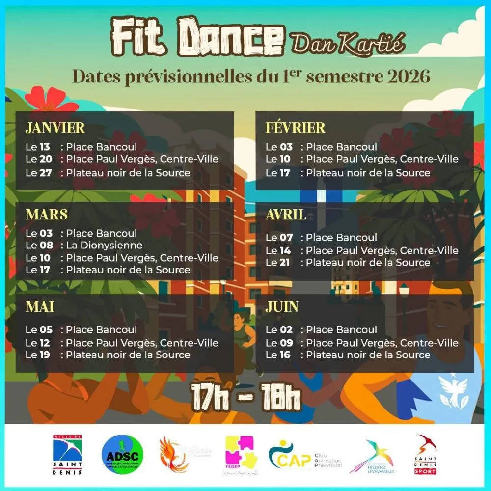 Le programme Fit Dance dan Kartié revient dès le début de l’année 2026 avec un calendrier déjà bien rempli pour le premier semestre. De janvier à juin, ces séances gratuites de danse et de remise en forme investiront plusieurs lieux emblématiques de Saint-Denis, afin de rendre l’activité physique accessible au plus grand nombre.