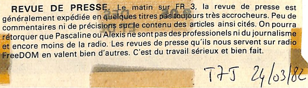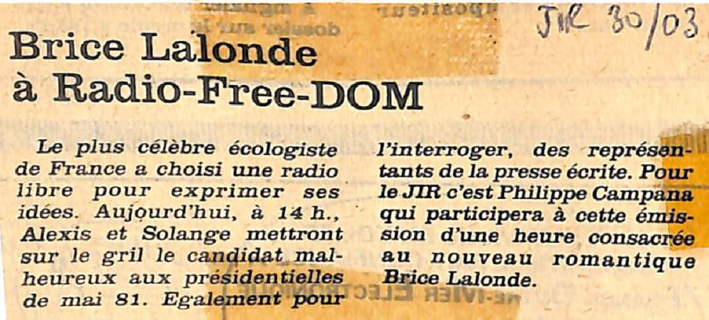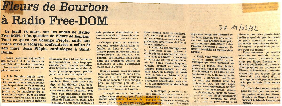 1982 « Fleurs de Bourbon » par Solange Pieplu par La Rédaction 29 mars 1982 1 min de lecture Ne manquez pas toute l’actualité de La Réunion ! Abonnez-vous à la newsletter de Free Dom ! Valider Partager Facebook Twitter Pinterest Linkedin Whatsapp Reddit Email Vous pourriez être intéressé par 10 décembre 1982 Un canular par jour sur Radio Free Dom 11 octobre 1982 L’émission « pas de canard sans navet » 7 octobre 1982 L’émission « bleu outre-mer ou la radio de la méduse… » La Rédaction Laisser un commentaire Annuler la réponseYour email address will not be published. Enregistrer mon nom, mon e-mail et mon site dans le navigateur pour mon prochain commentaire. Current ye@r * Leave this field empty Article précédent Pascaline fait les revues de presse de Free Dom Article suivant Brice Lalonde interrogé par Alexis, Solange et Philippe Campana du JIR Articles récents... Mercredi 31 décembre 2025 – Météo, éphéméride et horoscope du jour Hommage à Johnny Hallyday sur Free Dom 2 ce 5 décembre Mardi 30 décembre 2025 – Météo, éphéméride et horoscope du jour Saint-Joseph : découverte de 2337 plants de cannabis, arrestation de 2 individus Point sur le réseau routier départemental, 29 décembre à 16H30 Suicide sur le pont de la Rivière d’Abord : importante mobilisation des secours et des forces de l’ordre Radier submergé à Ilet Furcy : la route de Cilaos fermée à la circulation cette nuit Fortes pluies : appel à la plus grande prudence à Saint-Paul Saint-Gilles-les-Bains : une route impraticable, les riverains montent au créneau (VIDEOS) Très grands excès de vitesse : un délit passible de prison depuis le 29 décembre 2025