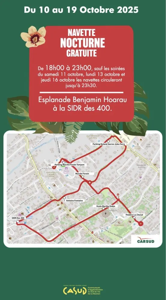 •Navettes nocturnes gratuites de 18h00 à 23h00/23h30 au départ de l’esplanade Benjamin Hoarau vers SIDR 400 ;