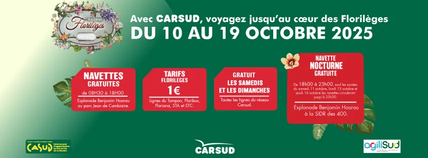 • Navettes gratuites de 8h30 à 18h00 au départ de l’esplanade Benjamin Hoarau vers le parc floral durant toute la manifestation ;
