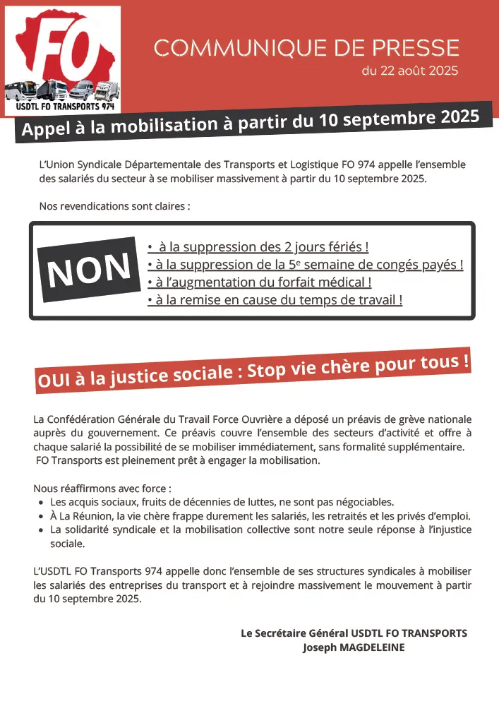 L’Union Syndicale Départementale des Transports et Logistique FO 974 appelle les salariés du secteur à se mobiliser à partir du 10 septembre 2025, dans le cadre du préavis de grève nationale déposé par Force Ouvrière.