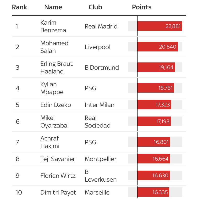 À la première marche du podium se trouve Karim Benzema, auteur de 10 buts et 7 passes décisives toutes compétitions confondues. L’attaquant français devance l’autre homme en forme du moment, Mohamed Salah.
