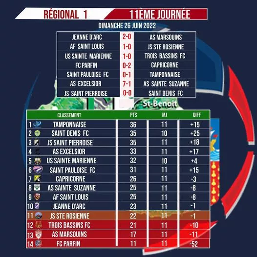 Le duel au sommet de la 11e journée de la régionale 1, entre la Saint-Pierroise et la St-Denis FC s’est soldé par un match nul. La Tamponnaise qui a battu la Saint-Pauloise FC sur un score d’un but à zéro se retrouvent ainsi provisoirement à la tête du classement, avec 36 points.