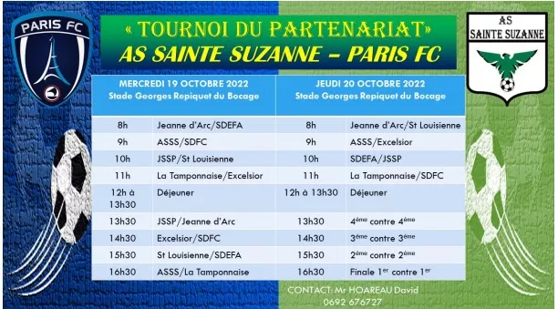 Pour concrétiser le partenariat de 3 ans annoncé il y a quelques semaines avec Ste Suzanne, le Paris FC sera donc présent comme prévu sur l’ile dans les prochains jours. Jean-Marc Nobilo, Directeur du Centre de Formation Paris FC et Patrick Gobert, Président de l’Association Paris FC avaient reçu début août à Paris, Yannis Rayepin, Président de l’A.S.Sainte Suzanne et David Hoareau, responsable des jeunes de l’AS Sainte-Suzanne pour une première réunion de travail.