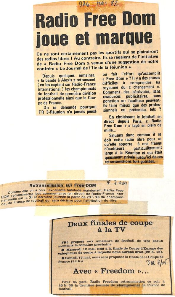 1982 Football sur Free Dom par La Rédaction 7 mai 1982 1 min de lecture Ne manquez pas toute l’actualité de La Réunion ! Abonnez-vous à la newsletter de Free Dom ! Valider Partager Facebook Twitter Pinterest Linkedin Whatsapp Reddit Email Vous pourriez être intéressé par 10 décembre 1982 Un canular par jour sur Radio Free Dom 11 octobre 1982 L’émission « pas de canard sans navet » 7 octobre 1982 L’émission « bleu outre-mer ou la radio de la méduse… » La Rédaction Laisser un commentaire Annuler la réponseYour email address will not be published. Enregistrer mon nom, mon e-mail et mon site dans le navigateur pour mon prochain commentaire. Current ye@r * Leave this field empty Article précédent Free Dom invente la « manifestation dansante » pour le 1er mai (gymnase des Deux Canons) Article suivant Article musclé de Laurent Vergès (Témoignages) Articles récents... Hommage à Johnny Hallyday sur Free Dom 2 ce 5 décembre Mardi 30 décembre 2025 – Météo, éphéméride et horoscope du jour Saint-Joseph : découverte de 2337 plants de cannabis, arrestation de 2 individus Point sur le réseau routier départemental, 29 décembre à 16H30 Suicide sur le pont de la Rivière d’Abord : importante mobilisation des secours et des forces de l’ordre Radier submergé à Ilet Furcy : la route de Cilaos fermée à la circulation cette nuit Fortes pluies : appel à la plus grande prudence à Saint-Paul Saint-Gilles-les-Bains : une route impraticable, les riverains montent au créneau (VIDEOS) Très grands excès de vitesse : un délit passible de prison depuis le 29 décembre 2025 Fermeture temporaire du sentier de la Canalisation des Orangers (cirque de Mafate)