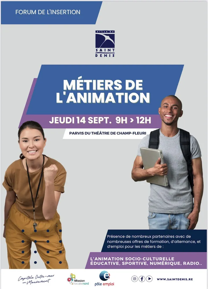 Ce jeudi 14 septembre, le parvis du théâtre à St-Denis sera le lieu de rencontre incontournable pour tous ceux qui envisagent une carrière dans les métiers de l’animation. En effet, de 9h à 12h, le Forum de l’Insertion accueillera de nombreux partenaires offrant une multitude d’opportunités de formation, d’alternance et d’emploi dans les domaines de l’animation socio-culturelle, éducative, numérique, et radio. C’est l’occasion idéale pour explorer les différentes voies professionnelles disponibles et faire un pas de plus vers votre future carrière dans l’animation.