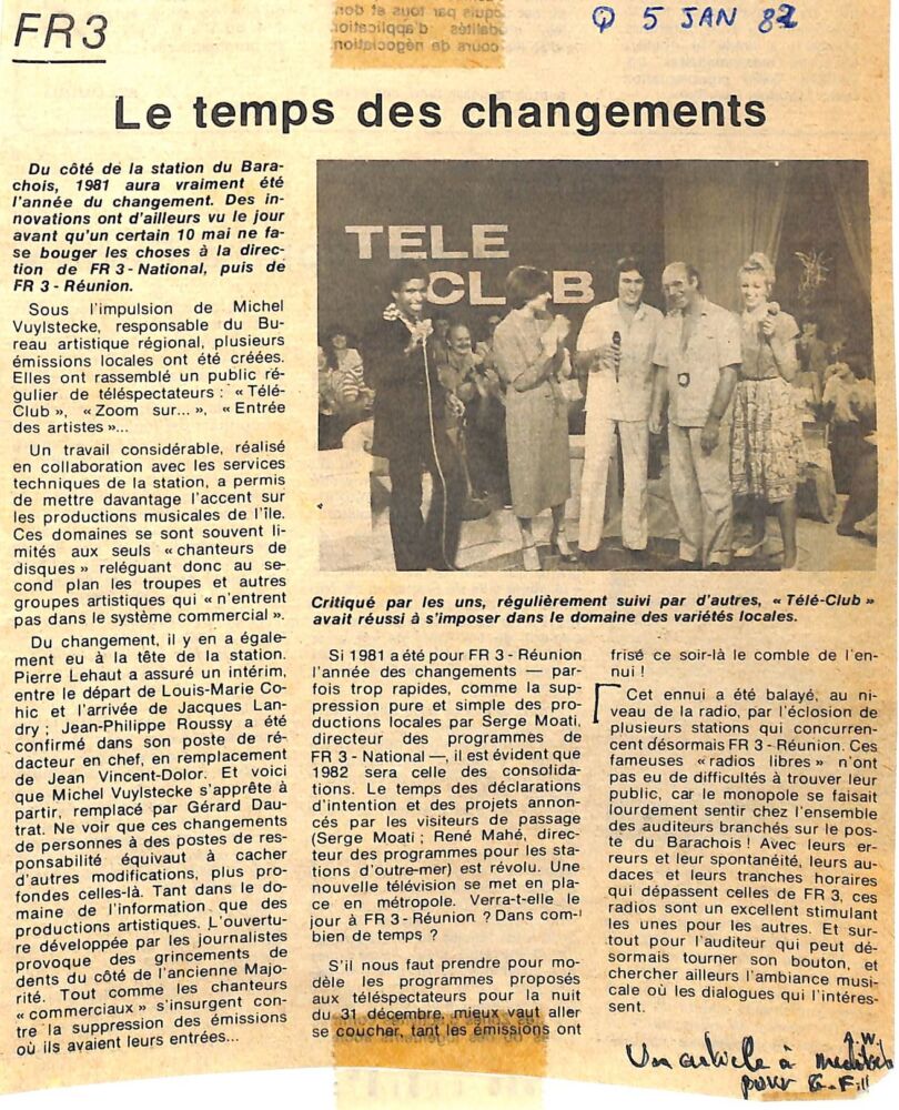 1982 FR3-Réunion poussé par « ces fameuses radios libres » par La Rédaction 5 janvier 1982 1 min de lecture (Albert Weber du Quotidien) Ne manquez pas toute l’actualité de La Réunion ! Abonnez-vous à la newsletter de Free Dom ! Valider Partager Facebook Twitter Pinterest Linkedin Whatsapp Reddit Email Vous pourriez être intéressé par 10 décembre 1982 Un canular par jour sur Radio Free Dom 11 octobre 1982 L’émission « pas de canard sans navet » 7 octobre 1982 L’émission « bleu outre-mer ou la radio de la méduse… » La Rédaction Laisser un commentaire Annuler la réponseYour email address will not be published. Enregistrer mon nom, mon e-mail et mon site dans le navigateur pour mon prochain commentaire. Current ye@r * Leave this field empty Article précédent Air France nous fait payer le prix fort pour le transport d’une antenne de radio Article suivant Les animateurs privés de liberté et enfermés derrière une grille Articles récents... Hommage à Johnny Hallyday sur Free Dom 2 ce 5 décembre Mardi 30 décembre 2025 – Météo, éphéméride et horoscope du jour Saint-Joseph : découverte de 2337 plants de cannabis, arrestation de 2 individus Point sur le réseau routier départemental, 29 décembre à 16H30 Suicide sur le pont de la Rivière d’Abord : importante mobilisation des secours et des forces de l’ordre Radier submergé à Ilet Furcy : la route de Cilaos fermée à la circulation cette nuit Fortes pluies : appel à la plus grande prudence à Saint-Paul Saint-Gilles-les-Bains : une route impraticable, les riverains montent au créneau (VIDEOS) Très grands excès de vitesse : un délit passible de prison depuis le 29 décembre 2025 Fermeture temporaire du sentier de la Canalisation des Orangers (cirque de Mafate)